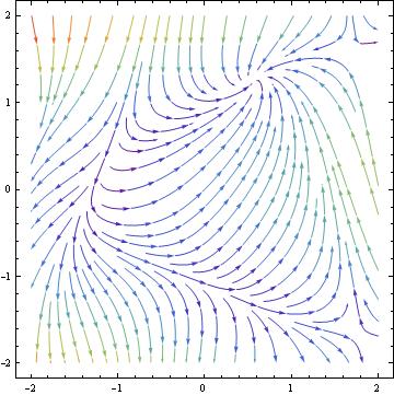 StreamPlot[{Cos[x^2 + y], 1 + x - y^2}, {x, -2, 2}, {y, -2, 2}, StreamColorFunction -> "Rainbow"]