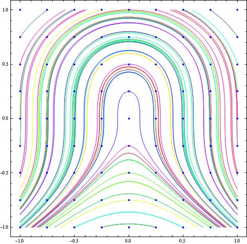 StreamPlot[{-y^2, Sin[x]}, {x, -1, 1}, {y, -1, 1}, AspectRatio -> Automatic, StreamPoints -> {pts, Automatic, Scaled[2.3]}, StreamScale -> None, Epilog -> {Blue, PointSize[Medium], Point[pts[[All, 1]]]}, ImageSize -> Large]