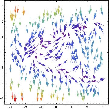 VectorPlot[{Cos[x^2 + y], 1 + x - y^2}, {x, -3, 3}, {y, -3, 3}, VectorColorFunction -> "Rainbow", VectorPoints -> RandomReal[{-3, 3}, {300, 2}], VectorScale -> {Small, Automatic, None}]