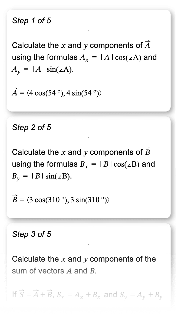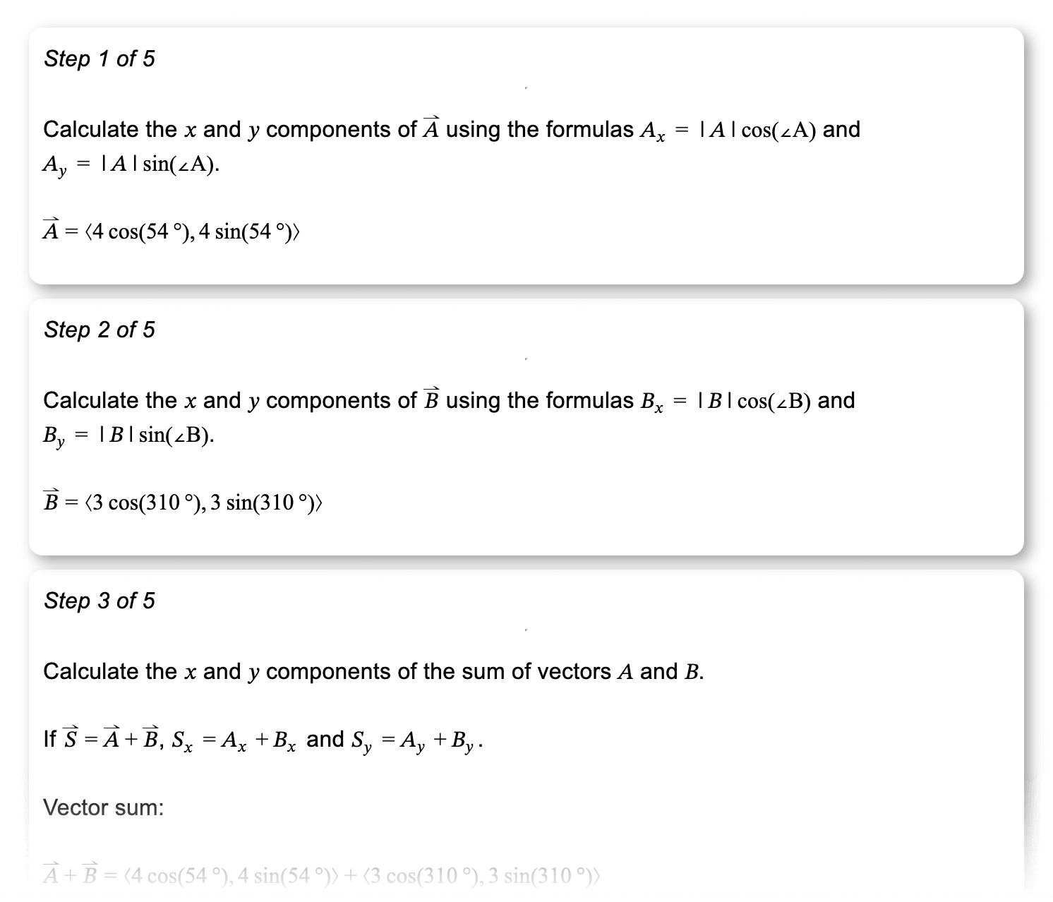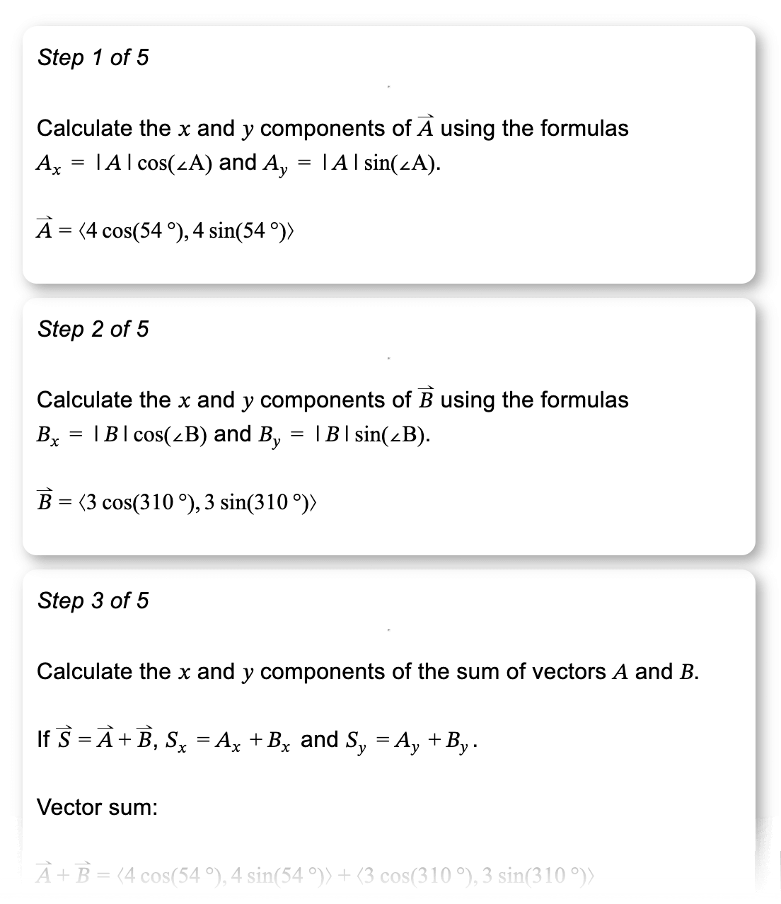 Find the magnitude of A ⇀ + B ⇀ , where A ⇀ has a magnitude of 4 at 54 degrees and B ⇀ has a magnitude of 3 at 310 degrees.