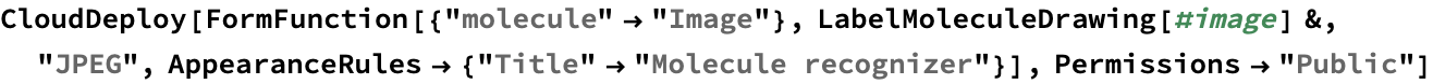 You will often want to share a program with others, and the Wolfram Language makes it easy to turn your code into a standalone, interactive webpage. Using the CloudDeploy function, your code will be published to Wolfram Research servers and be made accessible to either everyone or to whomever you grant permission. In this example, an interactive program for recognizing an image of a molecule is turned into a public webpage.