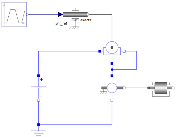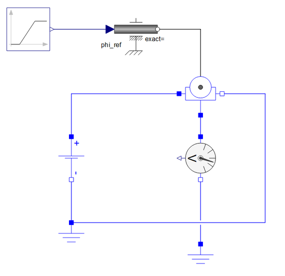 Un potentiomètre à molette peut être connecté dans une configuration de rhéostat, fonctionnant comme une résistance variable. La broche de la borne connectée à la masse est alors court-circuitée avec la broche du curseur. Cela signifie que la tension sur la borne du curseur sera la même que sur les deux bornes. Le rhéostat a été connecté en série avec un moteur. Le moteur entraîne à son tour un corps avec inertie. Le couple produit par le moteur sera proportionnel au courant qui le traverse. Comme le moteur est connecté en série avec le potentiomètre, le courant qui traverse le moteur sera le même que celui qui traverse le potentiomètre. En tournant le potentiomètre, le couple du moteur peut être contrôlé.