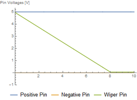 Dans sa configuration normale, un potentiomètre agit comme un diviseur de tension variable. Si une source de tension est connectée entre les deux broches, appelées bornes, la tension sur la troisième broche, appelée curseur, varie en fonction de la position de l’arbre du potentiomètre. Cet axe peut, par exemple, être contrôlé par un curseur ou une molette.