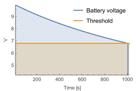 Simulating the model, we can see that after 5 seconds of operation the power switches from wall power to the battery. After 17 minutes, the battery cannot power the inverter anymore and the equipment turns off.