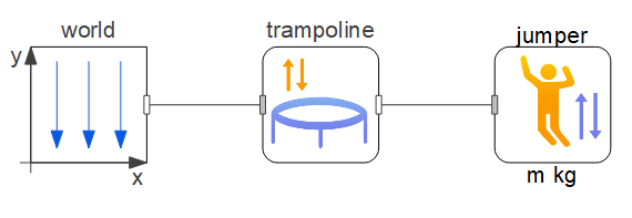 Para comprender el sistema del trampolín, utilizará un modelo que incluye tanto el trampolín como la persona que salta. El modelo consta de tres partes principales: un componente de mundo para la gravedad general, un trampolín modelado mediante una superficie elástica y una persona que salta modelad como un cuerpo rígido.